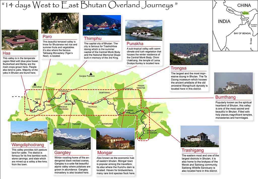 PARO, THIMPHU, HAA, PUNAKHA, GANGTEY, TRONGSA, BUMTHANG, MONGAR, TRASHIGANG